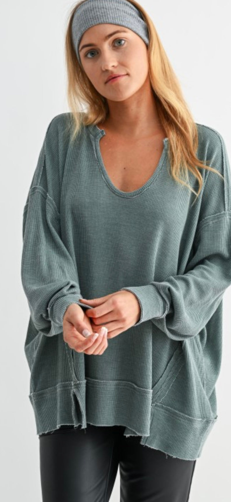 Soft waffle knit oversized long sleeve shirt. V-neck roomy and cozy! MUST HAVE! Another one from our Mono b collection.